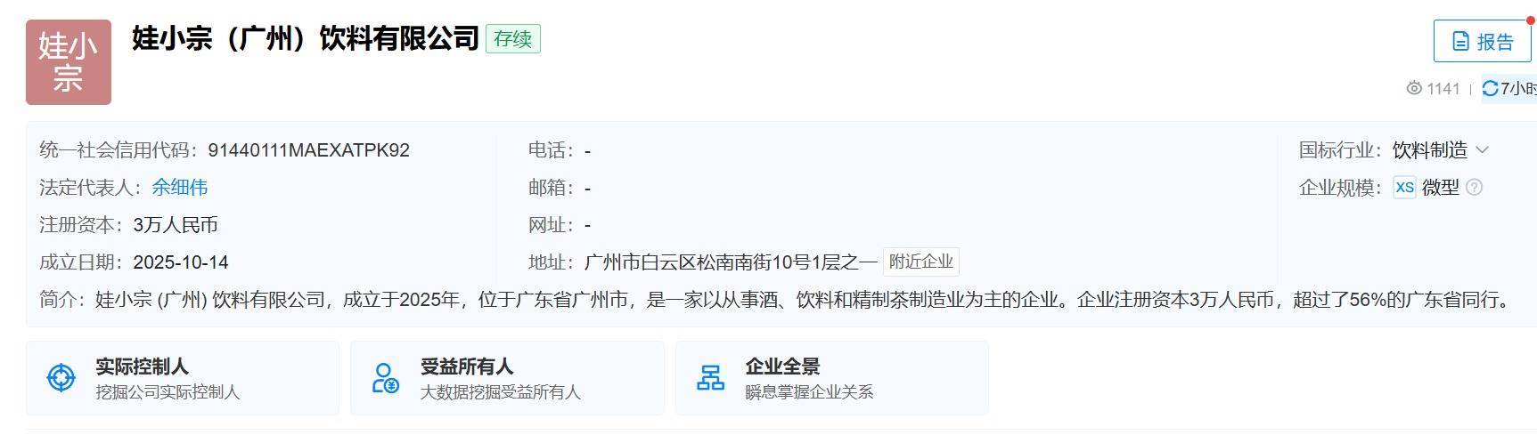 天眼查App显示,近日娃小宗(广州)饮料有限公司成立,注册资本3万人民币,经营范围为食品销售(仅销售预包装食品);食品互联网销售(仅销售预包装食品);销售代理;贸易经纪;办公用品销售;技术服务、技术开发、技术咨询、技术交流、技术转让、技术推广;家用电器销售;日用百货销售。