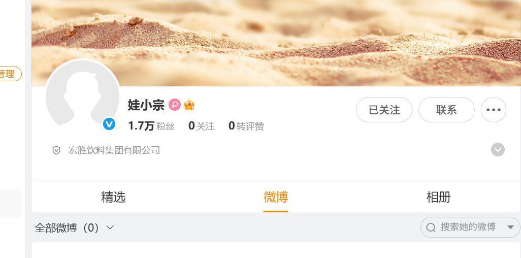 近期,娃小宗开通官方微博号,该账号认证主体为宏胜饮料集团有限公司,10月16日,潇湘晨报·辣椒财经记者查询到,目前娃小宗官方微博暂未发布任何内容,其账号粉丝已有1.7万粉丝。
